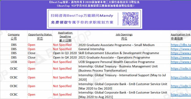 想要了解更多2020新加坡春招最新资讯和求职信息,欢迎大家来咨询BestTop专业顾问Mandy哦~