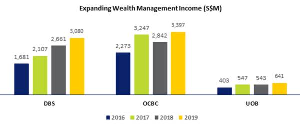 其中DBS财富管理部门的收入同比增长16%,OCBC的财富管理收入几乎占该银行2019财年总收入的三分之一,UOB在该部门的收入总计6.41亿美元,同比增长18%。