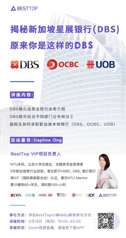 BestTop特地请来VIP Program Director Daphne, 她将以5年新加坡银行工作经历(4年DBS+1年渣打银行)现身说法,想知道如何在2020新加坡春招中求职本地三大银行,尽在本周四(Mar 19)19:00-20:00,快来报名吧!