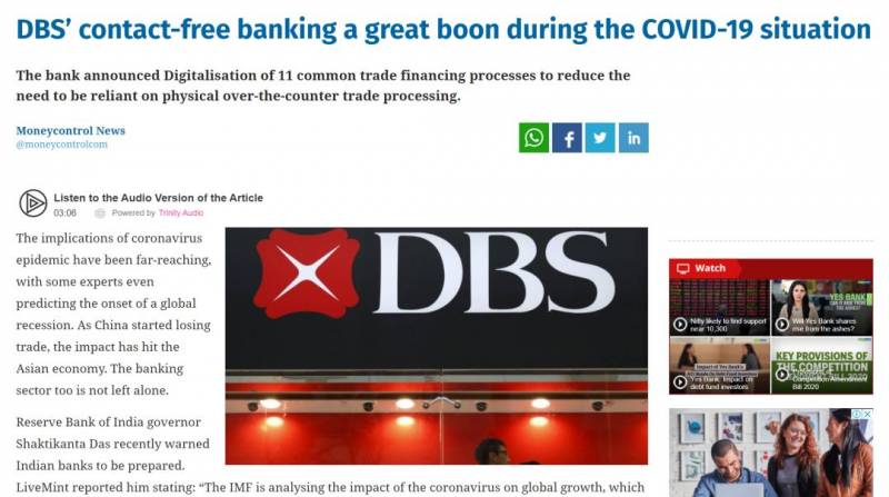 在COVID-19形势下,许多国家和企业都收到或多或少的波及,DBS也同样。但它立马改变策略,宣布对11种常见贸易融资流程进行数字化,以减少对实体柜台交易的依赖,并且每月为客户提供50次免费FAST交易,以减少对实体支票处理的需求。