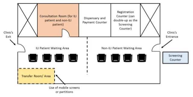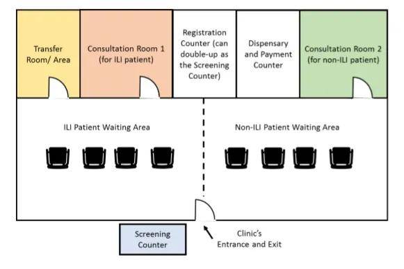 病人走进诊所后,为避免交叉感染,PHPC体系要求即便是再小的公共卫生防备诊所也必须为流感样疾病病人设置专门的、相对隔离的候诊区域、转诊等待区等,将疑似病例与其他疾病的患者隔开。而如果诊所实在地方太小,没办法为上呼吸道感染的病人提供单独的诊室,那就将他们与其他疾病患者的就诊时间错开。