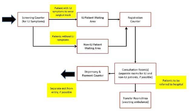 病人进入诊所前一定要经过筛查分流,诊所需要准备好有盖子的生化废弃物垃圾箱、筛查表格、体温计、一次性手套、洗手液、消毒剂,以及提供给流感样疾病病人佩戴的外科口罩等。