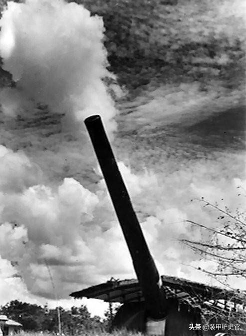 新加坡要塞的一门381毫米巨型要塞炮在高扬炮口准备射击。