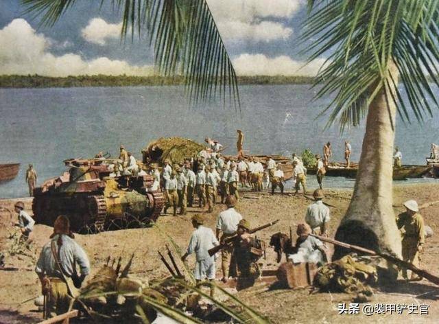 在炮兵掩护下正准备强渡柔佛海峡的日本第25军官兵,其中包括一辆九七式坦克。