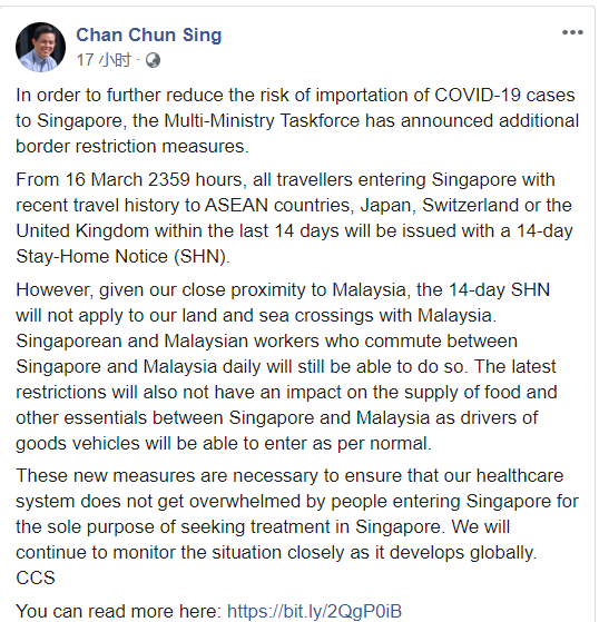 新加坡的食品和生活必需品不受影响 新加坡贸工部长陈振声说,新加坡和马来西亚之间的食物或其他必需品供应不会受新的边境管控措施影响。 陈振声在社交网站Facebook贴文说,通过陆路和海路从马来西亚入境的新加坡人和马来西亚人不受新措施影响,因此运货司机还是能照常入境新加坡。