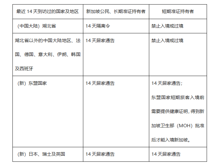 鉴于此,3月16日23时59分起,近期有包括文莱、柬埔寨、印度尼西亚、老挝、马来西亚、缅甸、菲律宾、泰国、越南在内的所有东盟国家,日本、瑞士、英国旅行史的人员(包括新加坡公民、长期/ 短期准证持有者),需遵守SHN的规定,自我隔离14天。此外,必须提供住址证明(例如隔离期间的酒店预订证明,或个人/亲属居住地址)。在入境新加坡后,即使无症状,仍会受到检测。