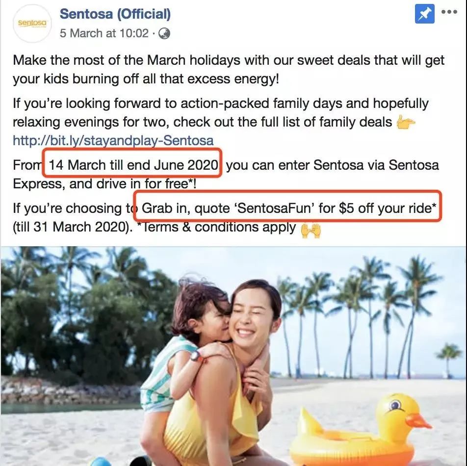 从3月14日起,访客如果乘搭圣淘沙捷运或开车到圣淘沙,将无须支付入岛费,一直到6月30日。从淡滨尼天地前往圣淘沙的接驳巴士也将免费提供服务,岛上交通也一律免费。并且岛上的商家也推出了多重促销活动,比如酒店优惠,景点门票打折,儿童免费用餐等。