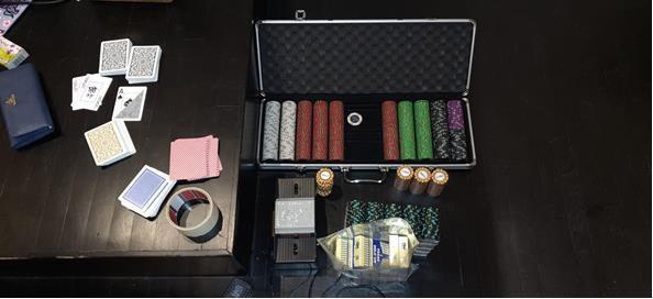 警方在店屋赌窟内起获的赌具包括全套的筹码,还有多副扑克牌。(警方提供)