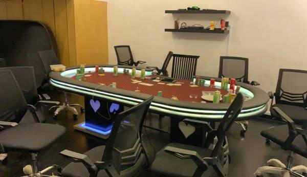 店屋内的赌桌上有扑克牌、筹码和食物饮料。(警方提供)