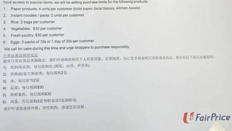 除此之外,NTUC现在也发出在FairPrice超市对蔬菜,大米,纸和其他产品施加的购买限制。