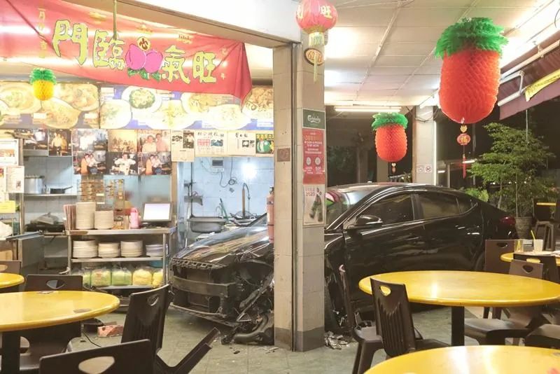 陈老板当时坐在肇事轿车前方桌子,轿车撞柱后停下,他才逃过一劫。(徐颖荃摄) 这起车祸发生在昨天(3月16日)深夜11时32分,地点是62B惹兰友诺士的金记60年代炒福建虾面的店面,涉事的是一辆黑色轿车。 老板陈贵金(73岁)告诉记者,当时已准备打烊,岂料一辆轿车突然失控直冲入店内,先撞上店外的电箱,再撞上柱子。