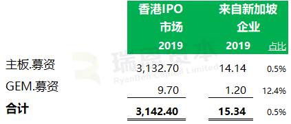 从募资的角度来看,2019年香港IPO总募资 3,142.40亿港元,来自新加坡的13家IPO共募资15.34亿港元,占全部募资总额的 0.5%;如果扣除前十大IPO的募资总额为 1,039.28 亿港元,来自新加坡的占比 1.5%。