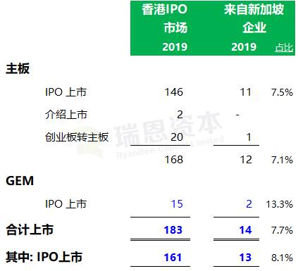 从上市的数量来看,2019年香港新上市183家,来自新加坡的14家,占比 7.7%;这183家新上市公司中的161家是通过IPO上市的,来自新加坡的IPO公司13家,占比 8.1%;其中主板 IPO的146家中,来自新加坡的 11家,占比7.5%。