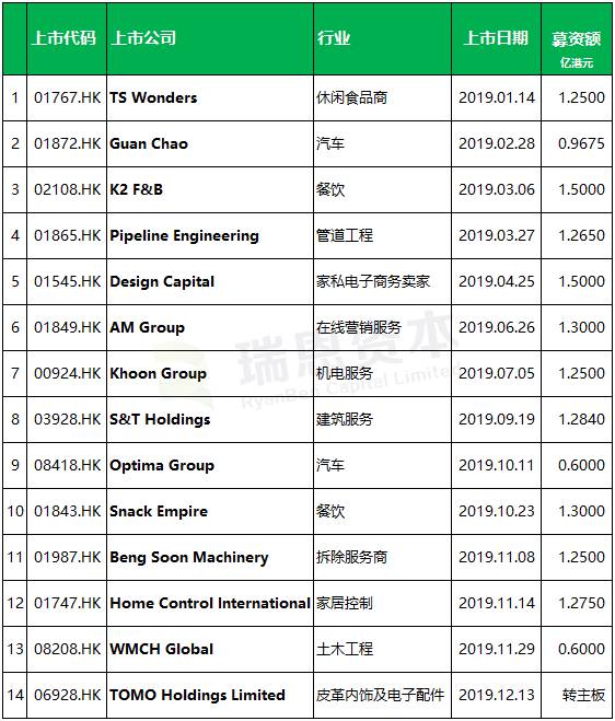 2019年,14 家来自新加坡的企业在香港上市,共募资 15.34 亿港元。