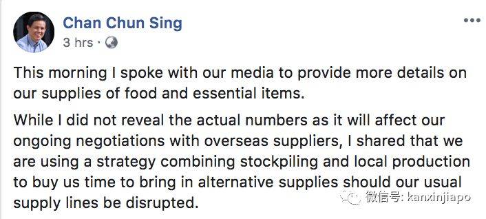 视频来源:陈川仁脸书 新加坡贸工部长陈振声接受媒体采访时说,新加坡的食品库存充足,米和面条的存货可供应超过3个月,肉和蔬菜可供应超过两个月。但随后他在脸书上坦白,说透露的数字并不精确,因为会影响新加坡与供应商谈判。