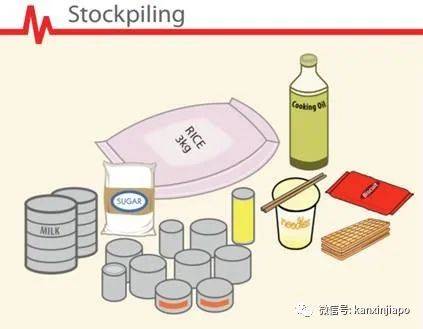 新加坡民防部队30多年来进行公众教育,其中一条就是让大家准备好应急粮食包,备好足够家庭每个成员使用14天的食品,为:3公斤大米、1瓶食用油、14个罐头(蔬菜、鱼、肉、豆类)、2包饼干、15包方便面、1包白糖(500g)、婴幼儿奶粉适量。