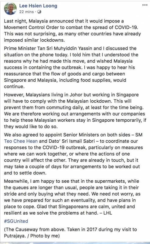 新加坡总理李显龙今午(3月17日)也在脸书发贴文表示,他今早与马国首相通电话时,首相慕尤丁保证新马之间包括食物供应在内的货物流动将不会中断,李总理对此表示欣慰。