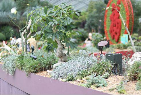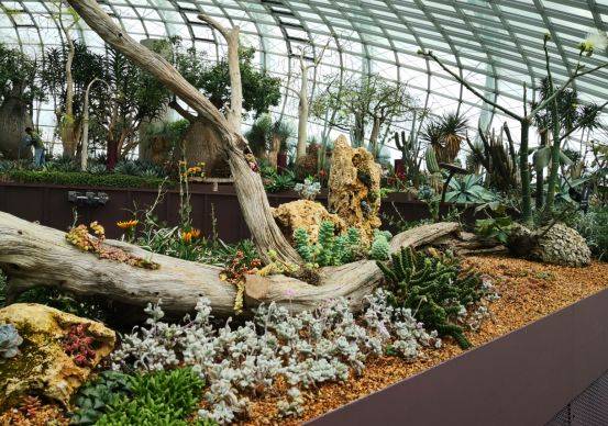 花穹最有特色的是多肉植物区,和传统国内设计的简单沙坑上种植多肉植物相比,这里的设计精致多了,高筑的花坛上布满各种多肉植物和热带乔木,砂砾结合小品精细化的组合,打造出精致的多肉植物组群植物景观。