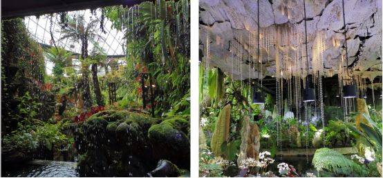 回到“云雾林”景点,云雾林,一个让你“腾云驾雾”的巨大冷室,冷室中央有座35米高的巨大山体,山体上生长著茂密的绿色植物和鲜花,巨型瀑布(30米高)则从山顶倾泻而下。这里模拟了热带山地地区和南美以及非洲高海拔地区凉爽潮湿的气候,有9个不同的区域,可以让人在探索中发现生物的多样性,并了解到云雾林的生态。