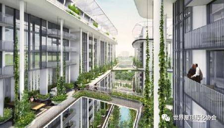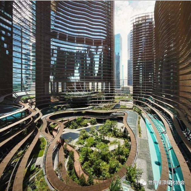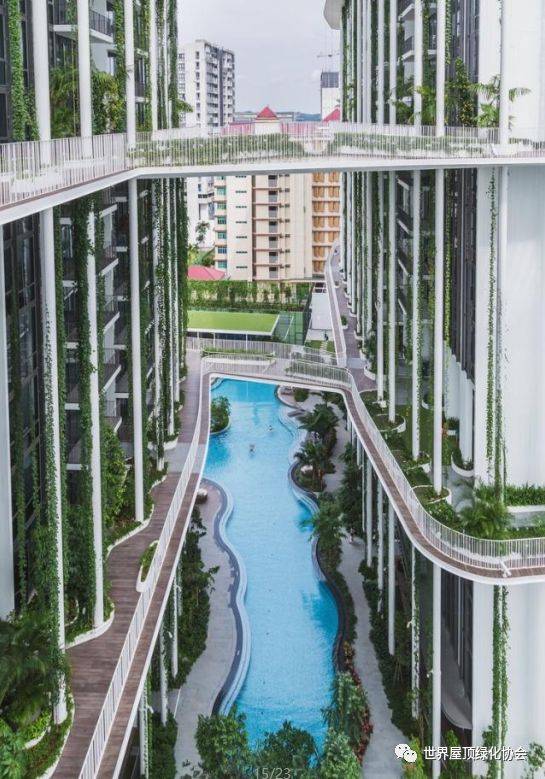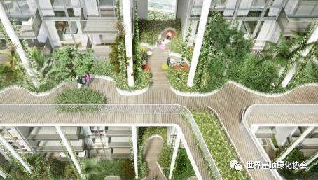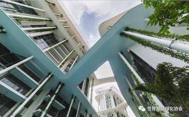 不同品种的攀爬植物和藤蔓植物的垂直丝结构创造了一个全新的生活立面。将建筑与自然融为一体,使高大立柱变的柔和。景观花园由许多小型花园组成,是一个巨大的环境过滤器。