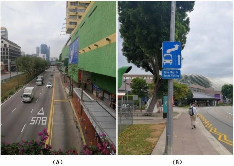 新加坡在公交车出站的交通管理方式上也有特别之处。一般情况下,当公交车接近路口要出站时,往往排队较长,高峰期甚至根本出不来,为此新加坡要求处于公交车道旁边车道的车要给公交车让路。配合这一规定,在道路上实行两种组织方式:一种是通过路面标识和路旁标识进行提醒,如图17A所示,从路口到公交车站到路段的地面上会有倒三角形、标有“BUS”字样的标识,同时还设置如图17B所示的标志,提前提醒驾驶人,前方有公交车,要让行,相应路段也会配有电子警察进行抓拍;另一种组织方式是在公交车出来的地方实划禁停区(见图18)。