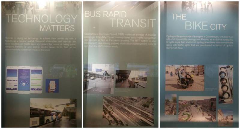 图1是笔者在参观新加坡城市规划馆时在名为Mobility的区域拍摄了六张海报(见图1),对具有代表性的国际交通发展的六个方面的成果进行了总结,也代表了新加坡未来城市交通发展的关注点。 第一张海报代表技术,展出的是赫尔辛基的MaaS(Mobility as a Service,出行即服务)新一代出行APP;第二张海报展示了广州的BRT,这是非常有代表性的一条BRT公交通道,每日运量达数十万;第三张海报则选了自行车出行比例较高的城市哥本哈根;第四张海报展现的是波士顿的“完整街道”,这是美国提出来的概念,近年在纽约、波士顿、旧金山比较多见;第五张内容是主要面向步行、自行车的绿色网络,是对整个城市道路绿色出行的考虑,选的是德国汉堡;第六张海报展示的是首尔对水域周边交通规划的做法,新加坡境内有一些大大小小的河流,在城市规划建设里也有基于河流的考虑。 虽然在我们来看,新加坡的交通系统已经很完善了,且每年在国际评估中也都排名前列,但是他们仍然在全球范围内寻找这些非常有代表性的案例进行对比、分析和学习。