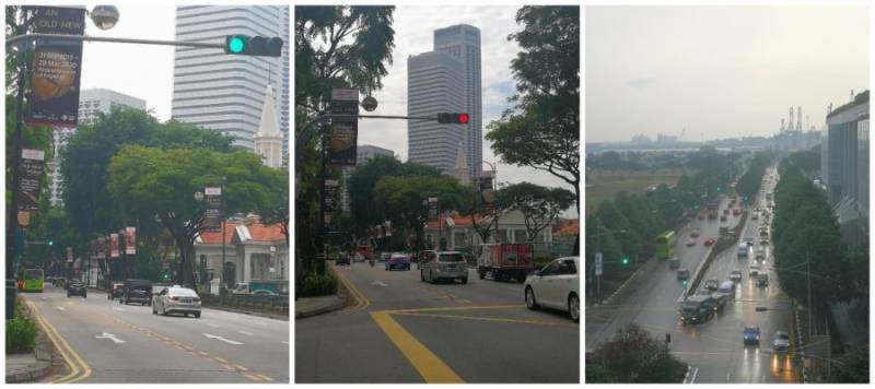 在新加坡,当连续几个路口的距离较近,比如两路口之间距离在150米到200米时,就采用同步放行方式,连续多个路口全部同时亮绿灯、同时亮红灯。例如,如果车速为15米/秒,绿灯时间30秒,车辆基本上可以通过3个相近路口;如果有60秒绿灯的话,车辆可以连续通过更多路口。图20是笔者拍摄的距离较近路口的协调控制,前两张拍摄于同一地点,同时红灯和绿灯,第三张为另一个地点拍摄,当时所有路口都是绿灯。这样的设置方式控制起来比较简单,不需要较为复杂的双向的协调相位差等,当然也要考虑适用范围。