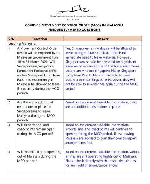 与此同时,新加坡驻吉隆坡最高专员公署及新山总领事馆官方面子书周三回应民众提问时声明,持有新加坡永久居民或新加坡长期通行证的马来西亚公民,被允许在管制行动令期间离境马来西亚,但是无法在这段期间重新入境。