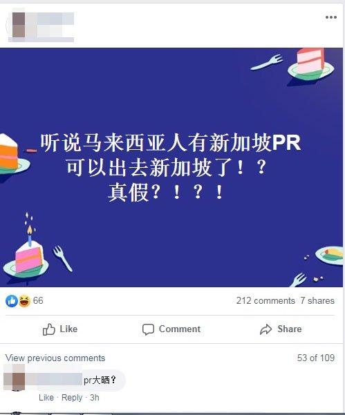 有网民在社交媒体上询问,传言指马来西亚公民持有新加坡永久居民身份可入境消息的真假。