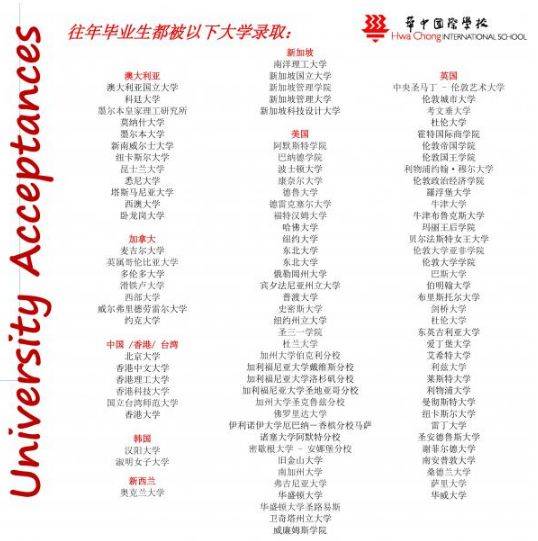据统计,华中有一半的学生可以进入史丹福、新加坡国大、新加坡南大等全球排名占据前列的世界名校。例如:牛津大学、哈佛大学、美国威廉士学院、香港大学、日本早稻田大学、加拿大麦吉尔大学、伦敦大学学院、加拿大英属哥伦比亚大学、墨尔本大学、美国波斯顿大学、英国利兹大学、澳大利亚国立大学、新西兰奥克兰大学等。