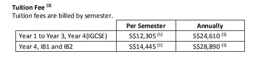 中一至中四(IGCSE):24610新币/年中四,IB一,二年级:28890新币/学学杂费:267.5-321新币