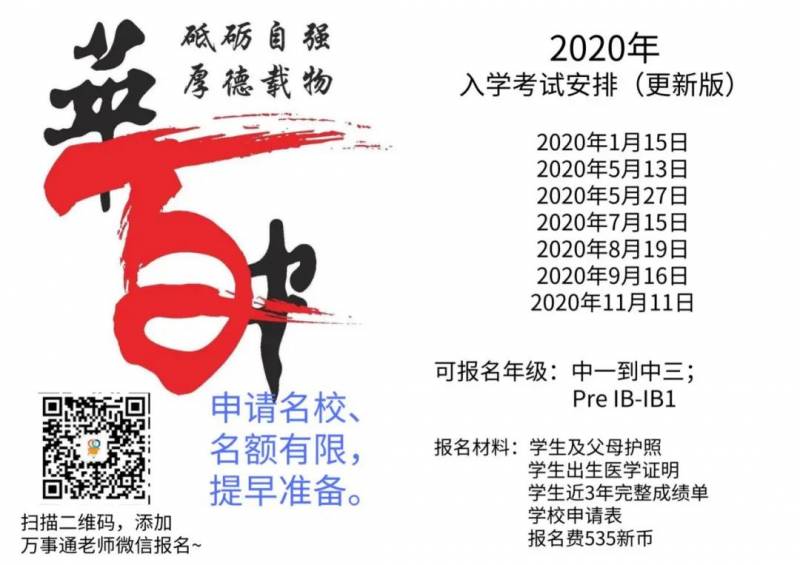 报名要求: 中国小学六年级毕业生,中学一年级至高二学生,英语良好;国际学校、双语学校和重点中学学生优先。考试科目: 英语 数学物理(中四以上)全英文一对一面试万事通老师会帮你一站式报名+约面试,安排入学测试、针对性考前辅导、办理学生文件审核、学校材料审核协助填写处理等服务。