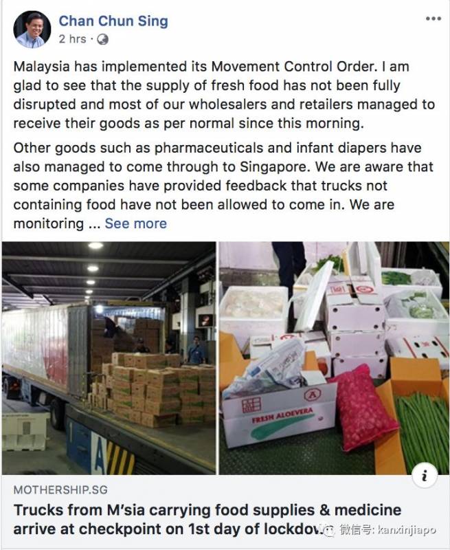 但从马来西亚运到新加坡的新鲜食品、药剂品和婴儿纸尿片等货物,在今早如常抵境。 根据贸工部长陈振声在脸书发布的贴文,大多数本地批发商和零售商都表示,今天和往常一样,收到从马国运来的新鲜食品,只有小部分的商家反映收不到货物。