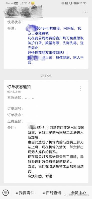 “封国”似乎也影响了包裹运送,有网友从中国预定了防护口罩,因马来西亚“封国”,导致工人无法入境新加坡,机场人手紧缺,派送延迟。