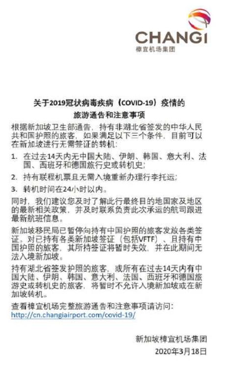 新加坡樟宜机场今天(3月19日)贴出通知,持有非湖北省签发的中华人民共和国护照的旅客,如果满足以下三个条件,目前可以在新加坡进行无需签证的转机:
