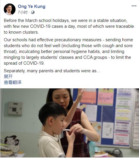 此外,新加坡教育部长王乙康说,教育部实施额外的防疫措施是因为必须以维护教育体系和学生安全为优先考量。王乙康在社交网站Facebook贴文说:“教育部在三月学校假期前采取了多项措施,病毒在校园内传播。”