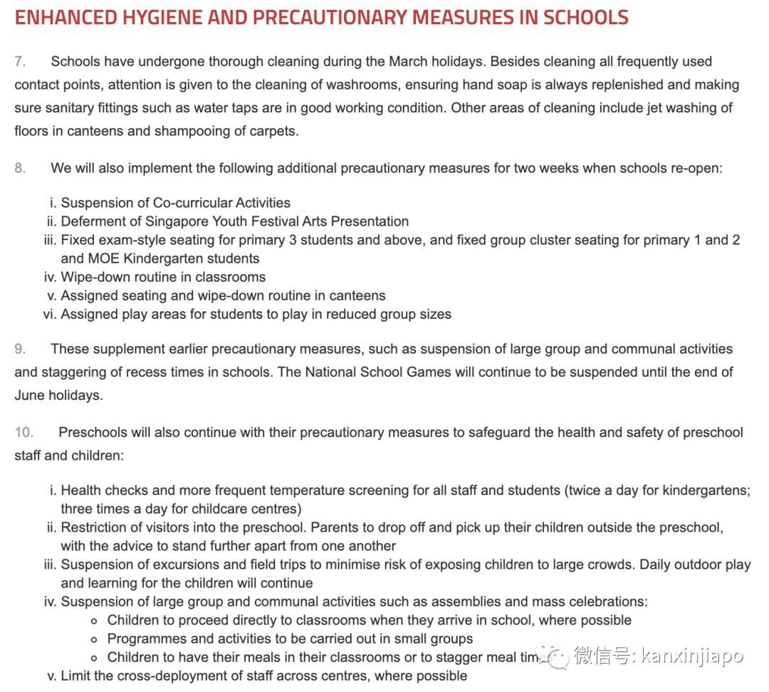(图源:新加坡教育部文告)本地学府在下个星期一(23日)开学后,会暂停课外活动和推迟青年节活动两个星期,以避免2019冠状病毒在校园里传播。校方也会规定分开小学三年级和以上年级学生的座位,类似考试的座位模式。