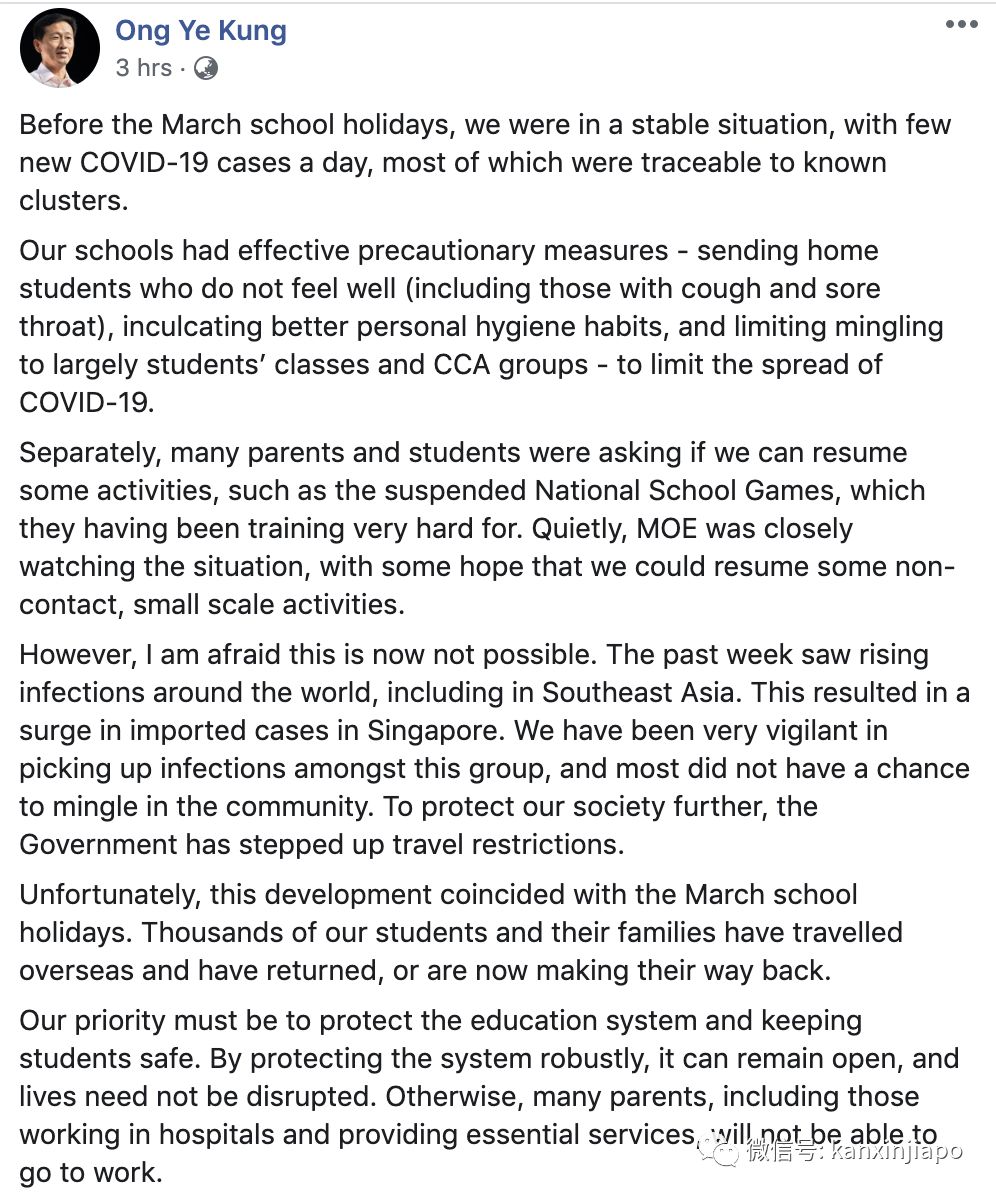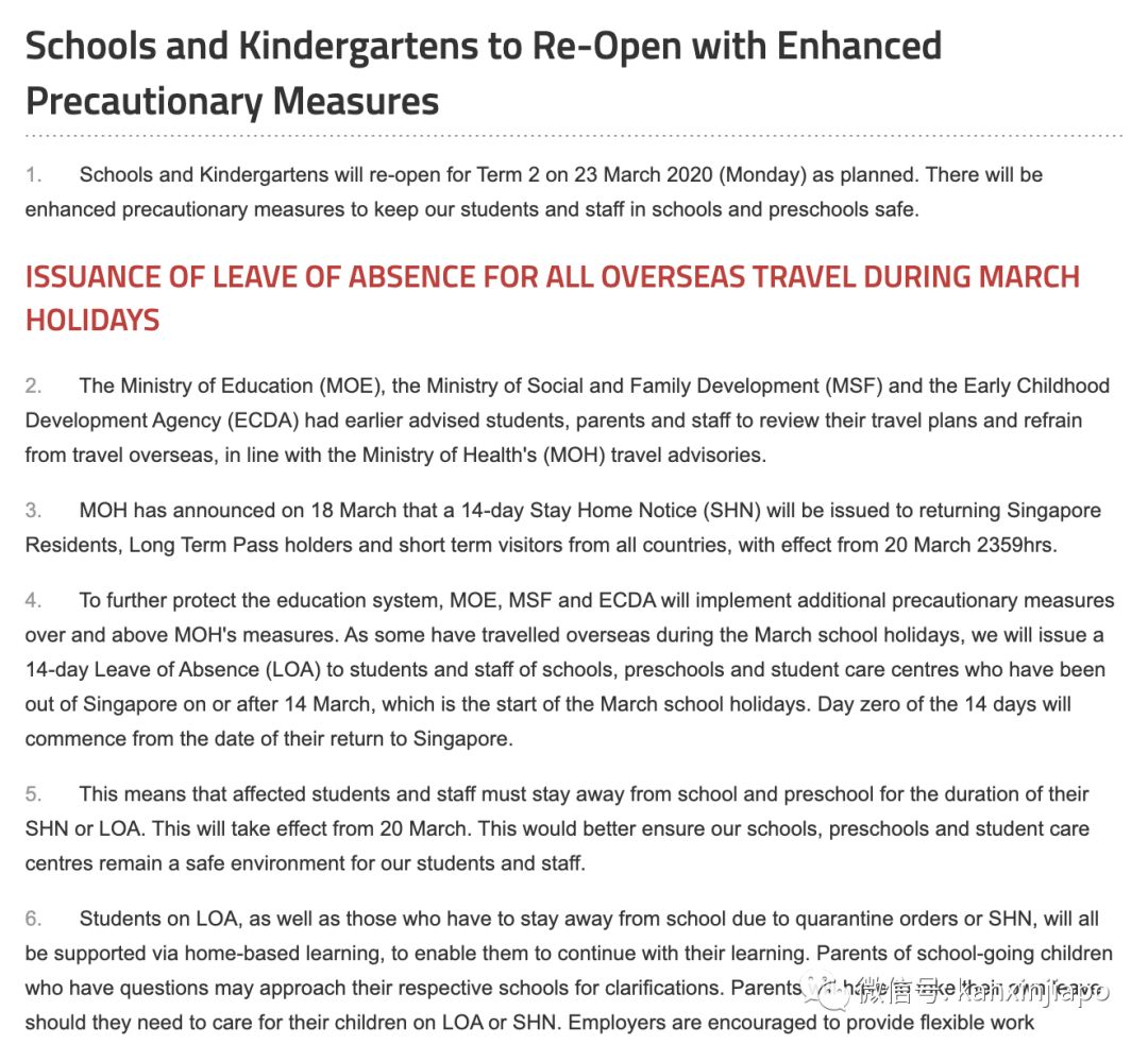 (图源:新加坡教育部文告)根据教育部和社会及家庭发展部发表的联合文告,除了卫生部早前公布的旅游限制外,教育部、社会及家庭发展部和幼儿培育署规定,从3月14日起离开本地的所有学生及教职员工,都须放缺席假14天。第一天的缺席假从回新隔天算起。