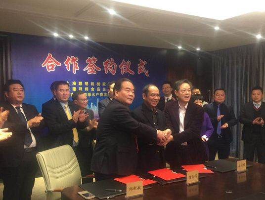 2017年,魏成辉(中)与中原四季水产物流港与上海联明机械股份有限公司合作签约仪式