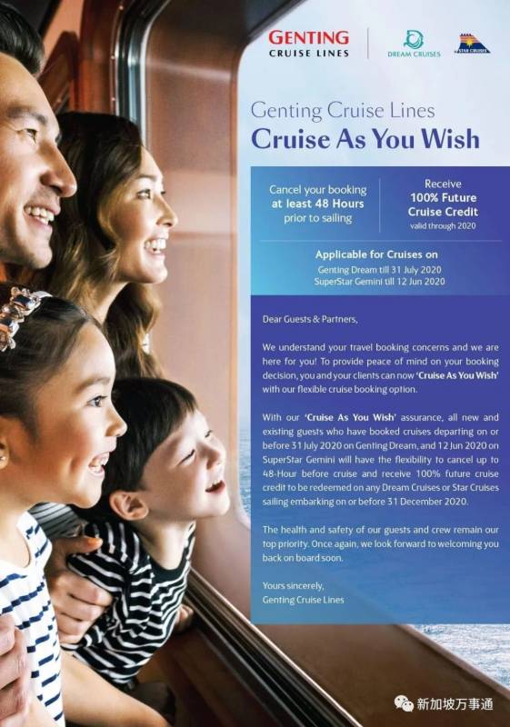星梦邮轮买一送一出发前48小时免费改签针对2020年5月到7月的所有新加坡母航,星梦邮轮也宣布将进一步升级原有的退改保证政策,宾客最晚在开航2天前免费改签。选择改签的宾客可选择2020年12月底星梦邮轮任意在售航次~