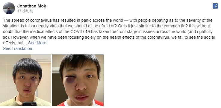 该名留学生左眼被打到肿了一块,亦有流鼻血,连下巴都有血迹。(图片来源Facebook/Jonathan Mok )