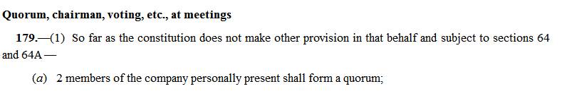 如果公司章程未指定法定人数,则必须亲自出席的最小成员人数为2名。