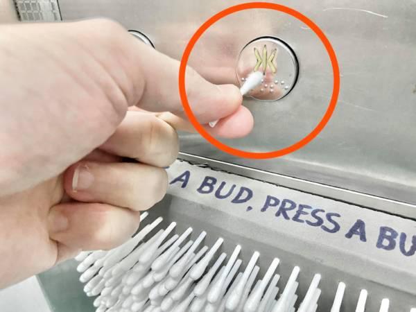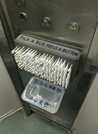 发起人还上载了照片进行示范。他已经在一个组屋电梯里装上了这个装置。照片显示,棉花棒都一分为二,整齐地插在电梯按钮下方的装置。每根棉花棒都是棉花头朝外,塑料棒朝内。还挂了一个上方有小口的透明塑料盒,上面写着“在此丢弃”(discard here)。