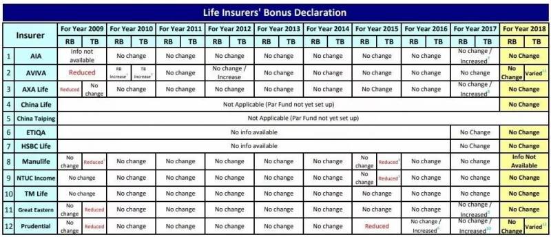 新加坡主要人寿保险公司从2009至2018年的保单分红情况,图中“No change”表示该年度按计划书上较高的4.75%正常分红。
