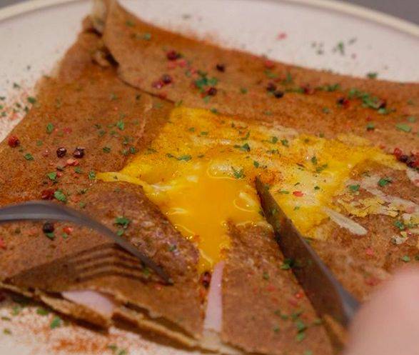 用荞麦粉制成的法式烤饼,颜色更深,并且具有更加坚果般的风味。crepe口味多样,最受欢迎的是Off The Bone,中间有火腿,芝士和溏心蛋,一刀切下去,流动的蛋液就喷涌而出,感觉棒极了。