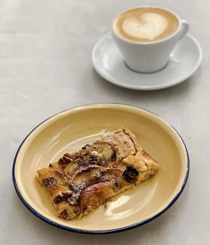 这里除了咖啡,还有甜品哦,蓝莓挞,桃子和梨混合挞,挞皮松软,上面铺满着著焦糖味的水果,yummy。