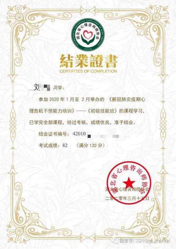 国内的证书竟然还把成绩和满分写上去...欧美国家的心理学发展比较健全,大家如果有相关需求不妨寻求一下当地的资源,获取心理支持,不要觉得自己恐慌,害怕,回避等情绪是怯懦的表现。重大疫情当前,有这些情绪都可以理解,是正常的应激反应。若是觉得语言会是一个障碍,也可以考虑一下国内开通的心理热线。如湖北心理热线:027-81880048而在新加坡的诸位,目前至少有两家咨询中心开设了免费的心理咨询热线,可以考虑与他们获得联系,在不直接接触的前提下获得情绪支持。