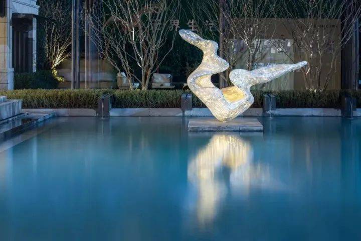 为了让这种度假的氛围更加充分,在建筑内外,连雕塑和标示都以水为灵感,取材自水中月,以水映满月,人月两圆: