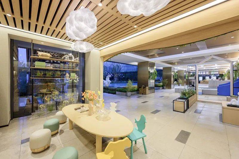 到了单元门厅前,东原还设计了室内外自然连通的多主题生活架空层,将24H便利店、花房、种子图书馆等“折叠”进建筑架空层。