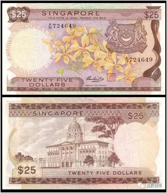25元币的正面主景图案为 "胡姬花",背面主景图案为最高法院大楼,票幅为14.0× 7.9厘米,主色调为棕色;